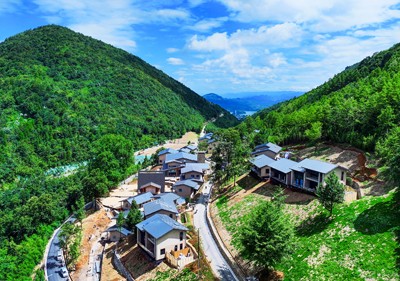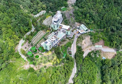2025年8月21日,鸟瞰四川省华蓥市利用红岩乡高顶村废弃的老龙洞煤矿改建的有熊猫元素的“原舍·嘿矿熊猫”主题民宿。