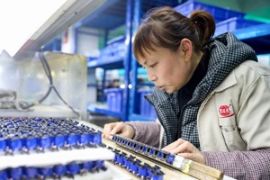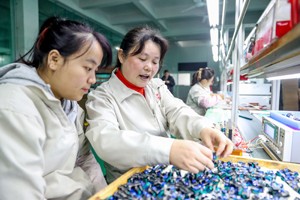 2024年2月19日,四川省华蓥市通过“春风行动”留在家乡的返乡民工,在华蓥山经开区大千电子有限公司生产流水线上安心作业。