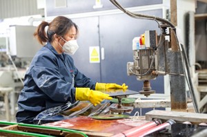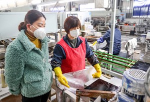 2024年2月19日,四川省华蓥市通过“春风行动”留在家乡的返乡民工,在华蓥山经开区领先微晶玻璃有限公司的新岗位上向老员工学习技能。(邱海鹰)