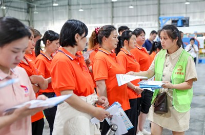 2025年6月23日,四川省华蓥市华蓥山经开区大千电子厂的务工人员,在领取禁毒志愿者发放的装有禁毒宣传资料等物品的“法治大礼包”。