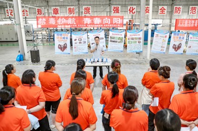 2025年6月23日,四川省华蓥市的禁毒志愿者在华蓥山经开区大千电子厂,给务工人员开展“禁毒护航,青春向阳”主题宣传活动。(邱海鹰/摄影报道)
