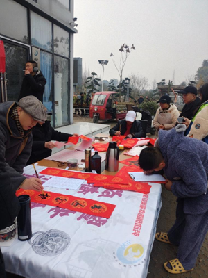 两个多小时,80多副对联,100多个“福”字,龙飞凤舞,烙印满园红春意。村民捧着对联,捧着福喜笑颜开,照相的、拍抖音的、打电话、发视频告诉远方亲人朋友的等,什么花样都玩出,他们只想把最美的时刻分享。是的,人们翘首便是春,举手相迎春满堂,闹腾着山水,抒发出美好的人生,年味浓香,对未来充满了希望。春,就是起点,奋发与拼搏永远在路上。祝福大家新春快乐!祝福国泰民安,未来更辉煌。