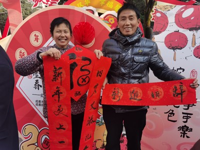 上午九时许活动拉开序幕,黄甲街道诗词楹联分会会长付仕水、会员廖白石、李连坤、白南顺及王树根五位老师铺开书写阵势,此时广大群众围了过来纷纷向老师们索要春联和福字,短短两个小时的活动老师们就送出了春联和福字200余副,深受广大群众的欢迎,住在空港新区的张婆婆领到春联后激动的说:“你们写得好,谢谢你们!你们辛苦了!我拿回去贴起就有了过年的喜庆和味道安逸”!(付仕水/文图)