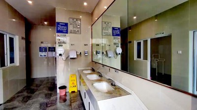 胡先生所说的公厕位于滨河路(赛丹景大桥对面,近朝阳北路)人行天桥下,采用川西民居风格,以青砖、青瓦为主,斜坡顶、薄封檐,与周边环境十分协调。公厕内男厕位有5个、女厕位有7个,并且配有家庭卫生间,环境干净、明亮又温馨。