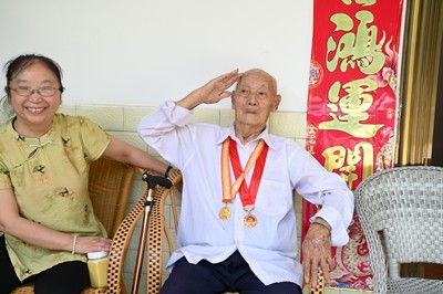 家住荣县高山镇红观音村的98岁抗战老兵范志华,听说退役军人志愿服务队的“战友”们要来看望他,早早的把抗战胜利80周年的纪念章佩戴在胸前,看到身着迷彩服的服务队队员走进院坝时,坐在轮椅上的他一个劲的挥手迎接。