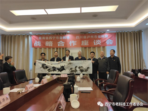 座谈会后由西宁市老科协代表向泸州市老科协赠送由协会专委会专家赵明老师亲手绘制的书画作品,寓意两市老科协和衷共济共创美好未来。(泸州市老科协)