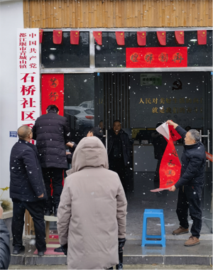 路祥林、高志林、唐启茂、蒋永勤、赵志伟老师现场书写春联100多幅,“福”字80多张。社区群众兴高采烈,将老科协书法老师团团围住,争先恐后,踊跃收藏。刘刚会长为石桥社区撰写的对联“踔厉奋发建和美乡村,笃行不怠谱石桥新篇”,由唐启茂书写后,张贴在石桥村活动中心大门口。在欢声笑语中,畅谈对新春期待,对龙年的展望。
