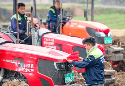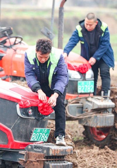 2025年2月3日,四川省华蓥市华龙街道东方村的农民在田间给“犁春牛”的“铁牛”佩戴大红花,准备动土翻耕农田迎接“立春”。(邱海鹰 刘南贤/摄影报道)
