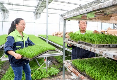 2025年4月9日,四川省广安市盛世农业有限责任公司邻水县袁市镇粮油基地的工作人员,在育秧中心给即将移栽的秧苗炼苗。(邱海鹰/文图)