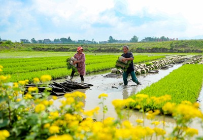 2025年4月27日,四川省华蓥市华龙街道东方村的农民在农田转运插秧机栽插的秧苗。(邱海鹰/文图)
