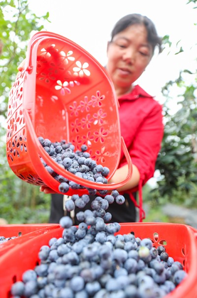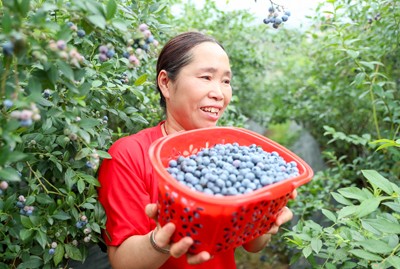 2025年6月4日,四川省华蓥市阳和镇三岔河村村民, 在村头的一眼蓝莓园归纳刚采摘的特色水果蓝莓。